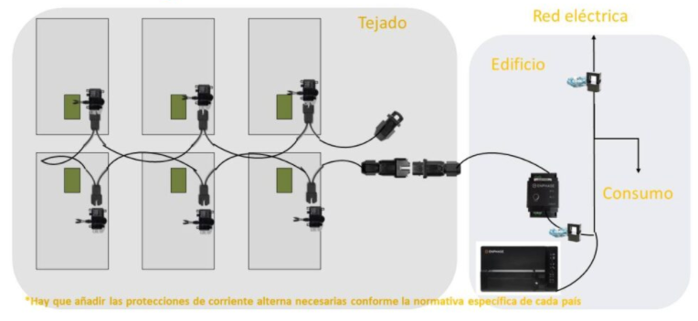 Los microinversores es una tecnología que cada vez más se está implementando en el mercado residencial. Este tipo de inversores tiene como característica principal que van conectados directamente al propio panel, es decir, transforman directamente la corriente continua de los paneles solares a corriente alterna, la necesaria en nuestras viviendas. La gran ventaja de este tipo de inversores es que cada placa solar funciona individualmente, por lo que, en caso de sombras o instalaciones con muchas orientaciones, nos ofrece un gran rendimiento. Además, los microinversores resultan muy útiles en instalaciones donde no hay posibilidad de instalar placas suficientes para llegar al voltaje mínimo de entrada de un inversor de string. Poder saber el rendimiento de cada placa por individual también es un plus a valorar.