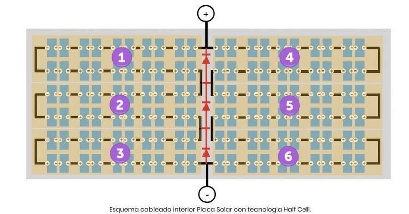 Paralelamente, algunos fabricantes han sacado al mercado un panel Half cells. Este tipo de panel se divide en 2 partes de 120 medias células. Eso nos ofrece siempre un 50% de producción cuando la sombra tapa medio panel, cosa que los paneles solares estándar no pueden ofrecer.