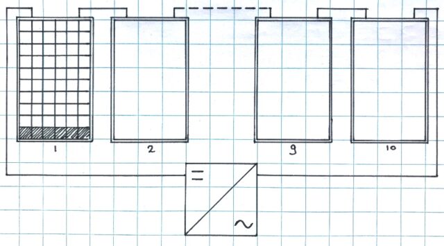 Tomemos como ejemplo un sistema de 10 paneles solares estándar conectados en serie a un inversor. Las pérdidas por sombra del primer panel son de un 33%.